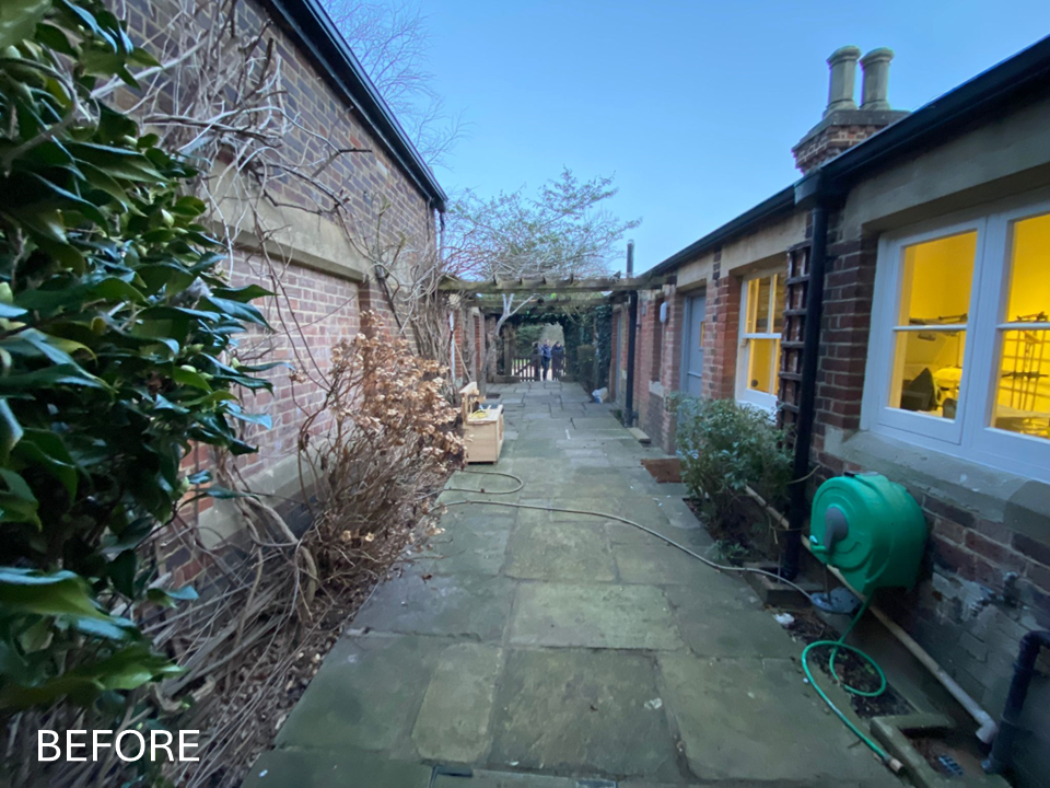 Client Brief: To transform an unused courtyard area. The courtyard had beautiful existing yorkstone & an established wisteria that were to be retained. Keep the natural, traditional features whilst injecting bold design & style to the courtyard to make it more useable and an attractive area of the garden to escape to. In order to achieve this, the original Yorkstone paving was retained, but with a simple “switch up” to re-invigorate what was an overgrown and unloved area of the grounds. Various slabs were removed on the perimeter, to create more pockets of planting to allow for a more verdant vibe to the courtyard which can be appreciated from both inside and outside the property.